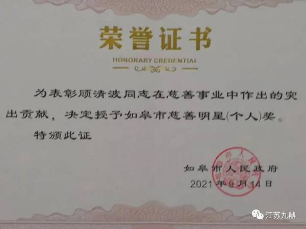 活動(dòng)對(duì)如皋慈善獎(jiǎng)優(yōu)秀單位和個(gè)人進(jìn)行了表彰,九鼎集團(tuán)等六家單位被市委、市政府授予六星級(jí)慈善明星單位,董事長(zhǎng)顧清波等三十六位企業(yè)家被市政府授予慈善明星(個(gè)人)獎(jiǎng)。