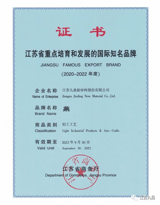 江蘇九鼎新材料股份有限公司“鼎”牌再度獲得《江蘇省重點(diǎn)培育和發(fā)展的國(guó)際知名品牌》,這是九鼎新材自2007年以來連續(xù)十四年獲此殊榮。(總經(jīng)辦提供)